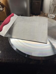 Once the cake was baked and ready to be frosted, I got to use two other of my very favorite kitchen tools: my decorating turntable and my cake lifter. Look: did I decorate cakes for years before I even knew these objects existed? You bet. But these are tools that make life easier, and isn’t that a good thing? This weekend I did not, aft first, deploy the turntable: after all, I wasn’t going for a highly finished cake. And the turntable lives in the basement along with a lot of my other cake-making paraphernalia (yes, I have that much. My husband still has his model trains in the basement. Don’t judge me). For a moment I didn’t feel like going downstairs to get the turntable. But as I started applying frosting to the cake I remembered how frustrating it is to have to turn the cake while it’s sitting on the counter, and how messy. I yielded to common sense and brought up the turntable, as well as my cake carrier (yet another indispensable tool for the cake maker). The base of the cake carrier is roughly the same size as the turntable, but if I tried to use it as a cake platter… 1) it would slip right off the turntable, with predictably distressing results, and 2) it would look awful. So I put the cake on the turntable and frosted it. Once all the frosting was in place I could rotate the turntable while scraping the sides, so they look nice and straight and smooth. The right tool for the project, right?